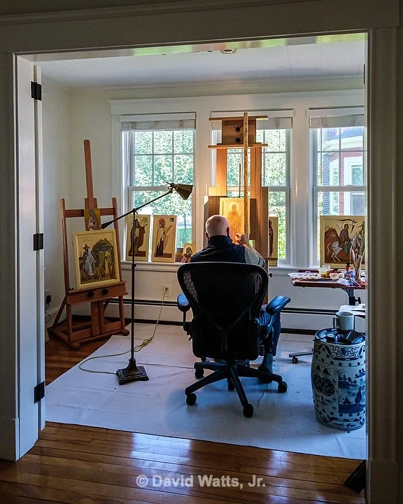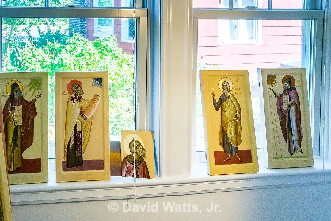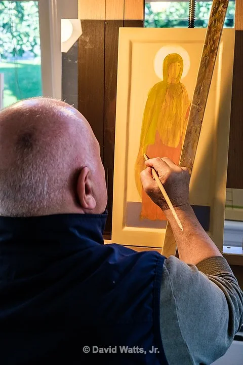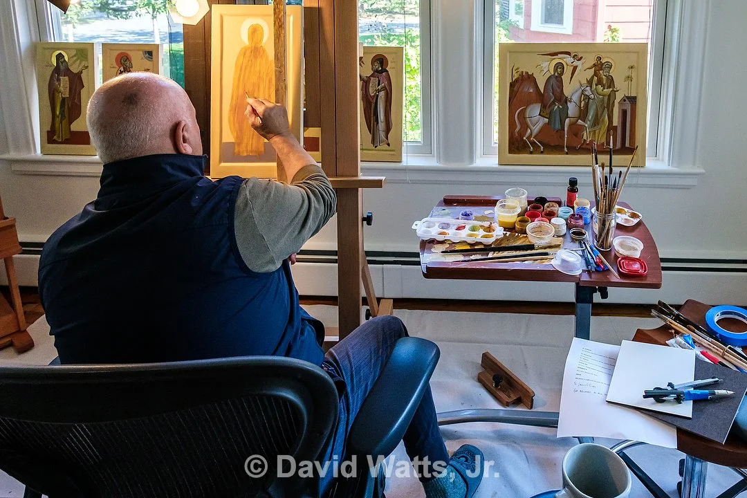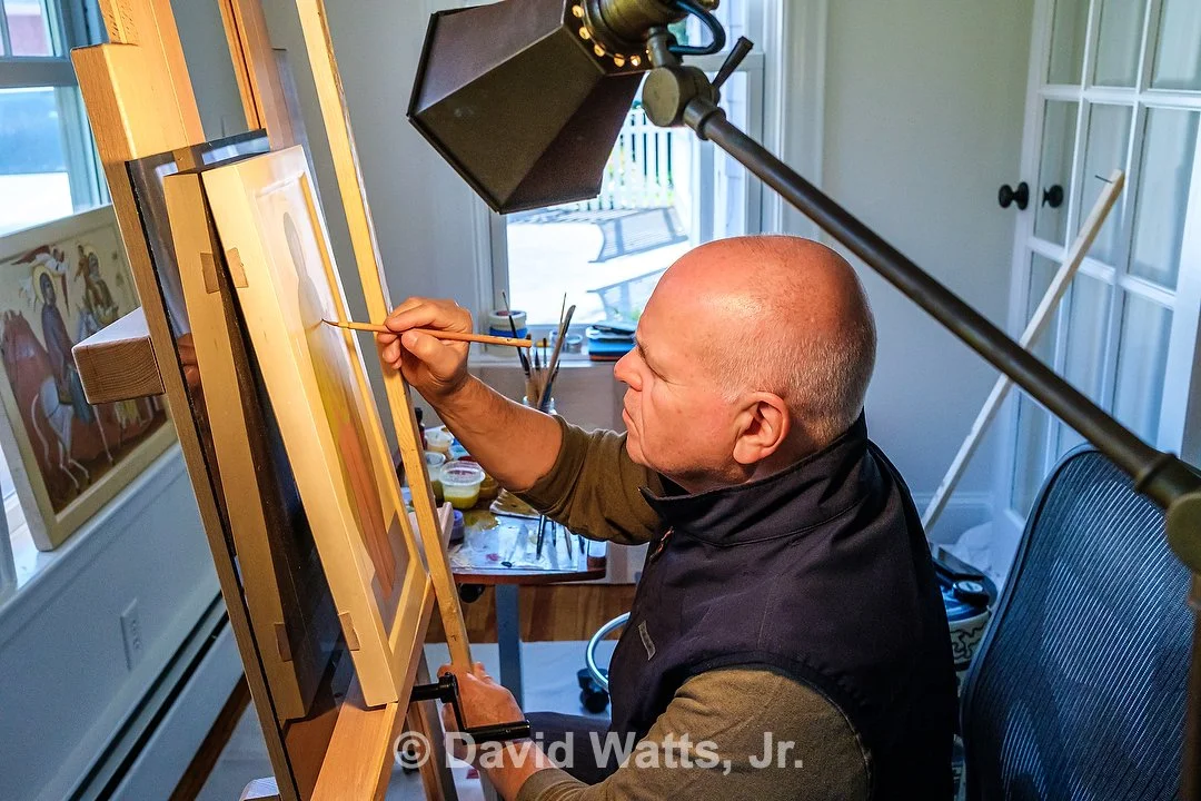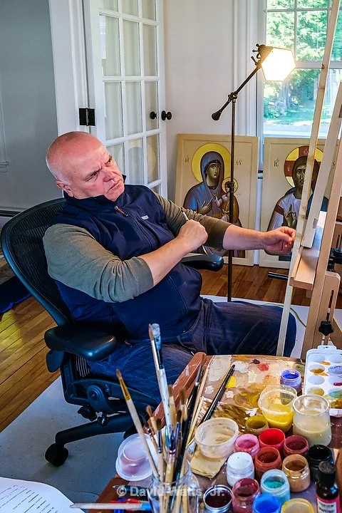 Learning from St. Paul we know merely looking at an icon is an act of worship. Although iconographers have different personal styles, the tradition of the Church dictates how the icon is composed. An icon is objective truth, not the subjective truth of the artist. Icons are written under the guidance of the Holy Spirit, not painted. Here are scenes of our iconographer Dr. George Kordis writing the holy icons for St. Nicholas on site at Egypt House in Marblehead.